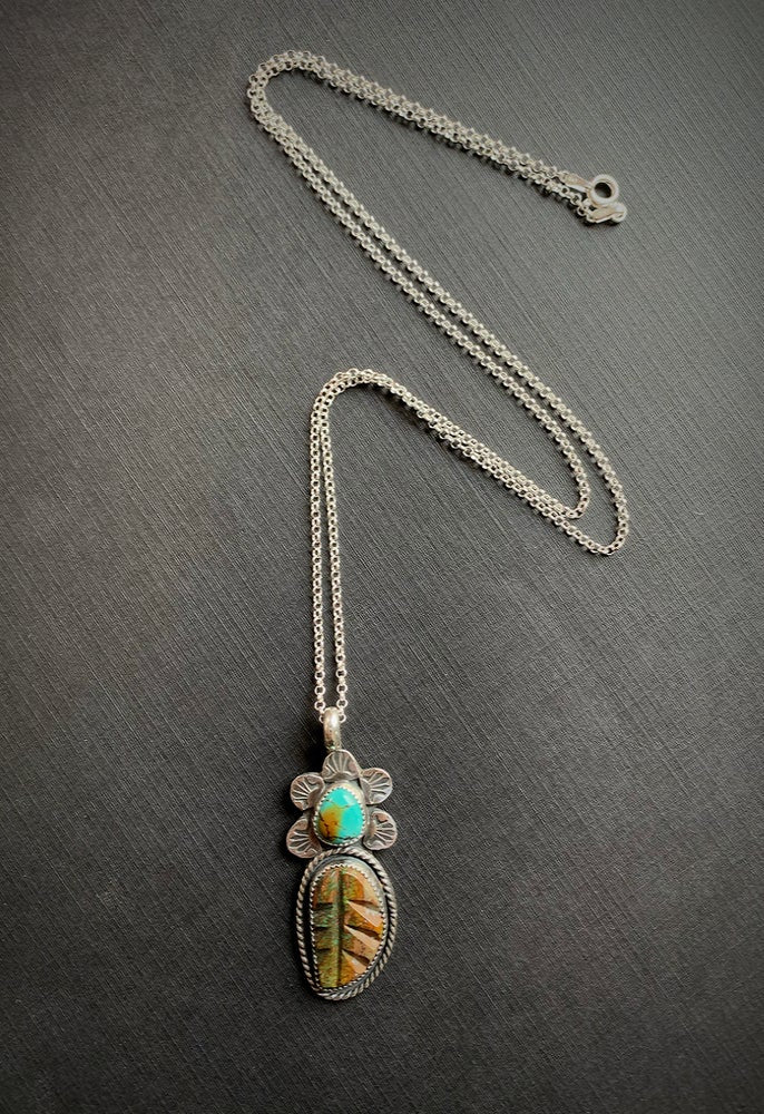 A fun and floral pendant made from a small turquoise cabochon and a carved turquoise leaf cabochon, set in a sterling silver floral inspired setting.
