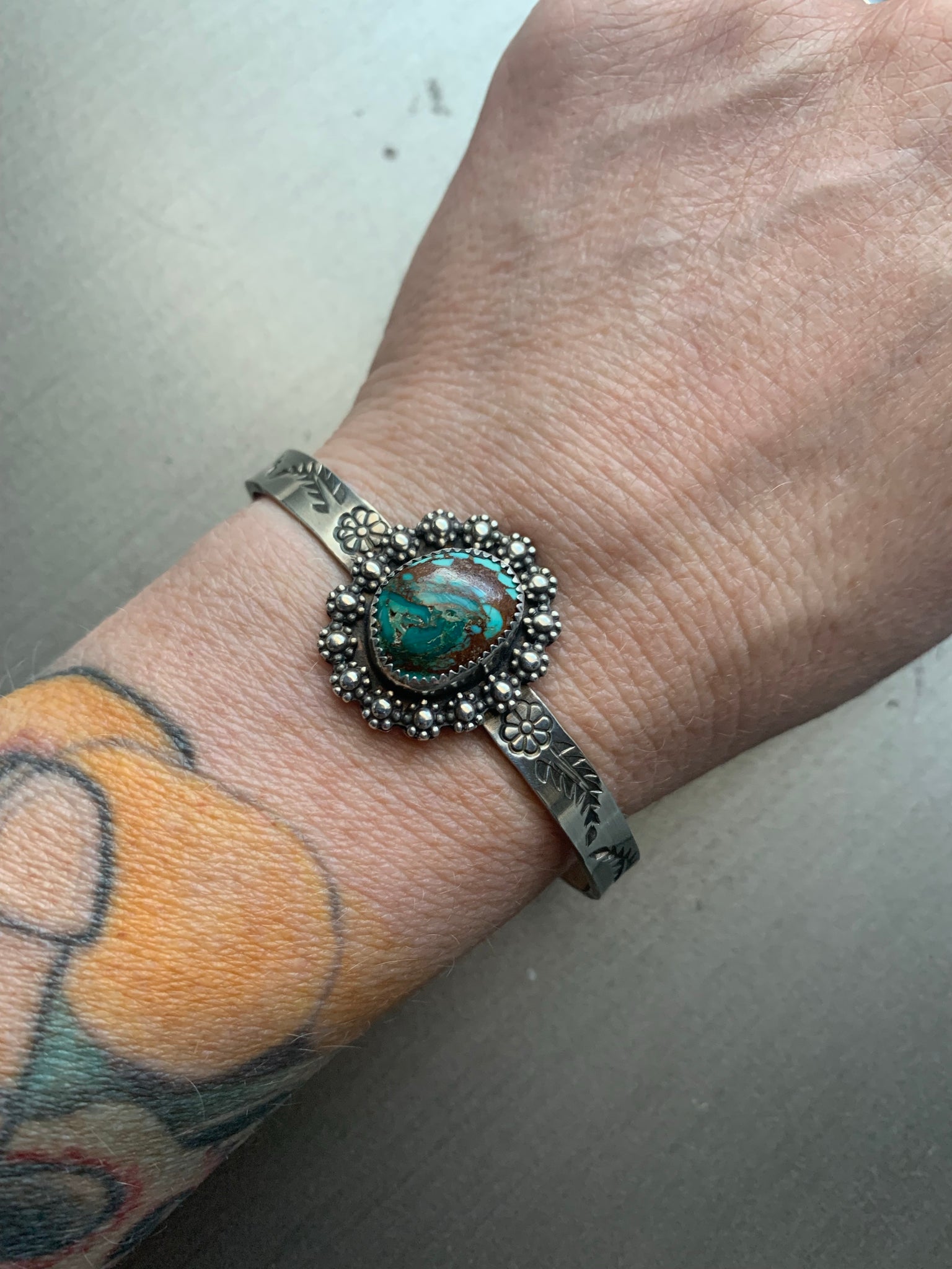 Sterling silver cuff bracelet with a turquoise cabochon nestled in a floral sterling silver setting. Thick 6 mm x 1.5 mm, hand stamped, sterling silver band. Cuff measures 6 inches around (size medium) with an approximately 1 inch opening. Handmade and stamped with love.