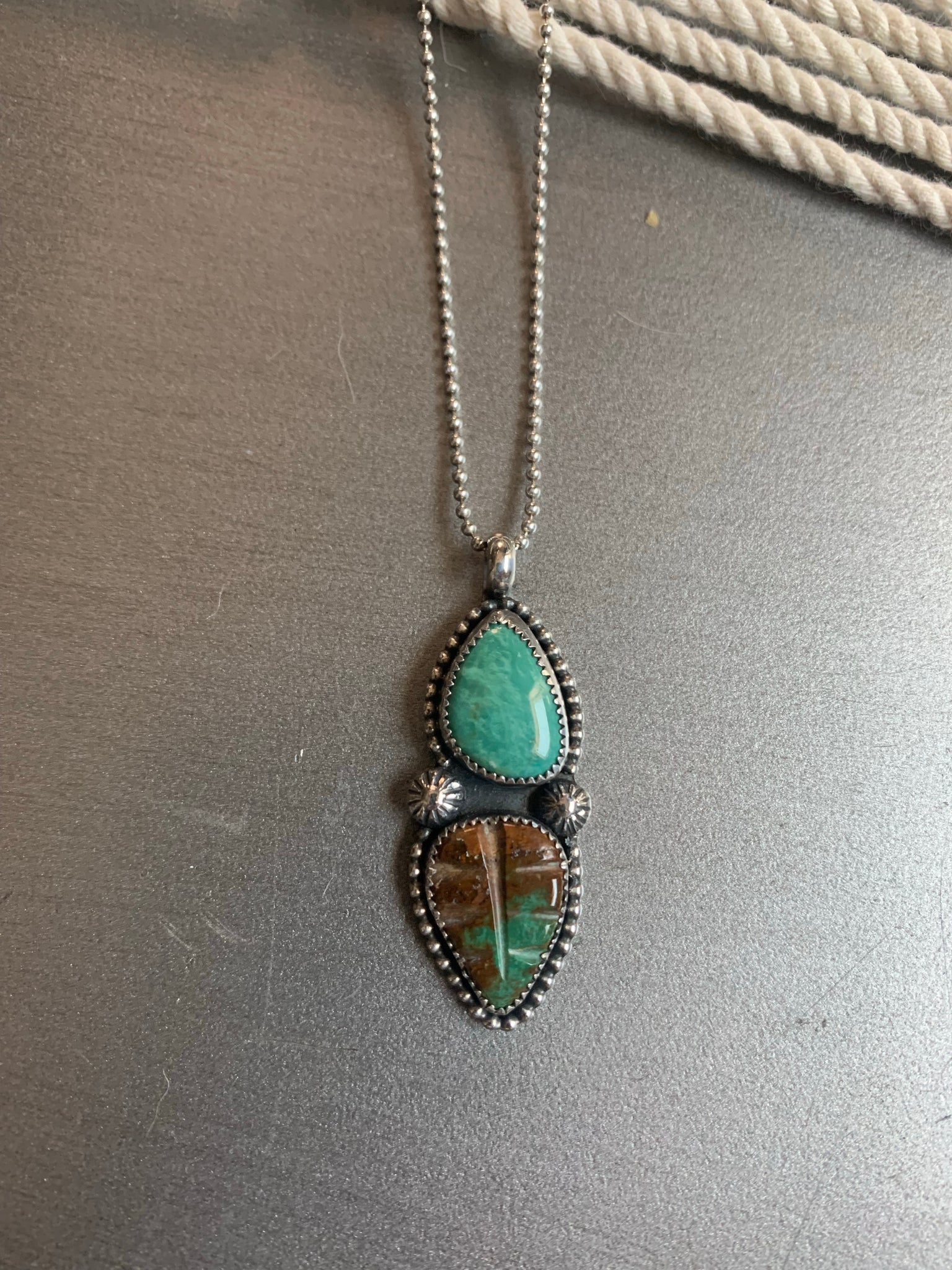 A pendant comprised x2 beautiful turquoise cabochons nestled in a detailed sterling silver setting, comprised of beaded sterling silver wire and recycled sterling silver floral shot.