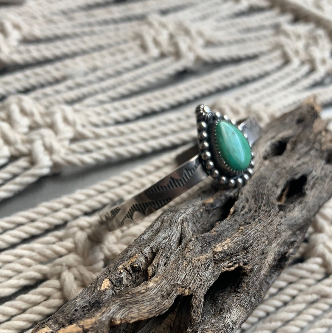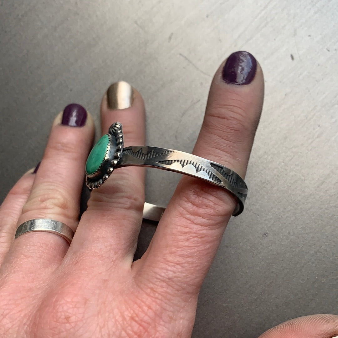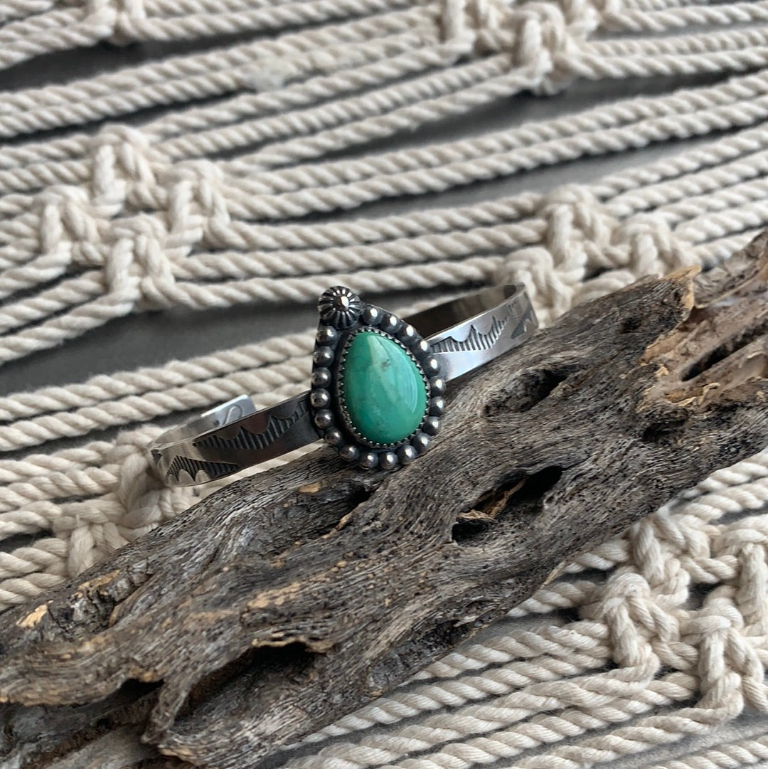 Sterling silver cuff bracelet with a turquoise tear shaped cabochon in a sterling silver beaded setting. Thick 6 mm x 1.5 mm, hand stamped, sterling silver band. Cuff measures 5 1/2 inches around (size small) with an approximately 1 inch opening. Handmade and stamped with love.